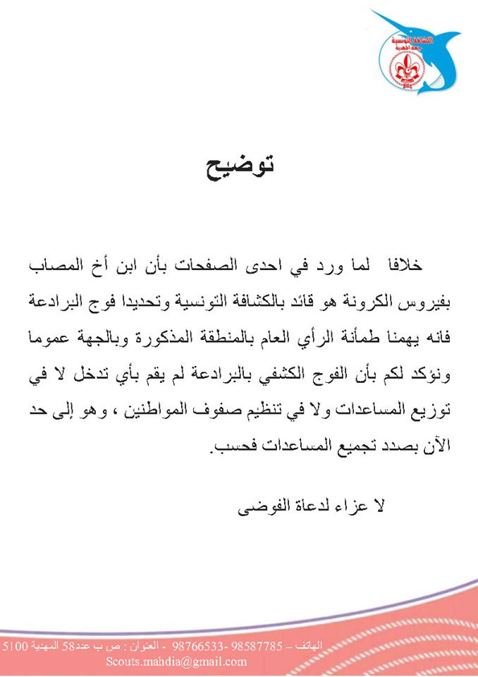 هذا الخبر ضاعف من إثارة الرعب في صفوف عديد المواطنين مما دعا الكشافة التونسية بجهة المهدية إلى اصدار بيان فندت خلاله ما تم ترويجه مؤكدا أن الفوج الكشفي بالبرادعة لم يقم بأي تدخل على مستوى توزيع المساعدات أو تنظيم المواطنين و إن مهمة الفوج إقتصرت فقط على تجميع المساعدات .