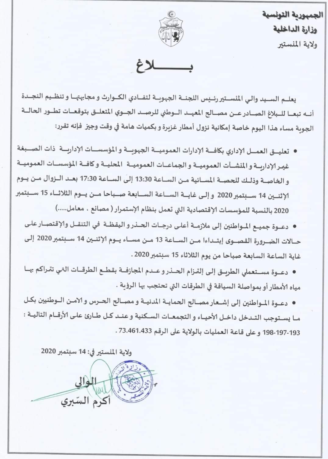 أعلنت ولاية المنستير في بلاغ لها منذ قليل تعليق العمل بكافة المؤسسات العمومية و الخاصة للحصة المسائية لليوم الإثنين 14 سبتمبر 2020 وذلك بسبب سوء الأحوال الجوية و التوقعات بتواصل نزول أمطار غزيرة.