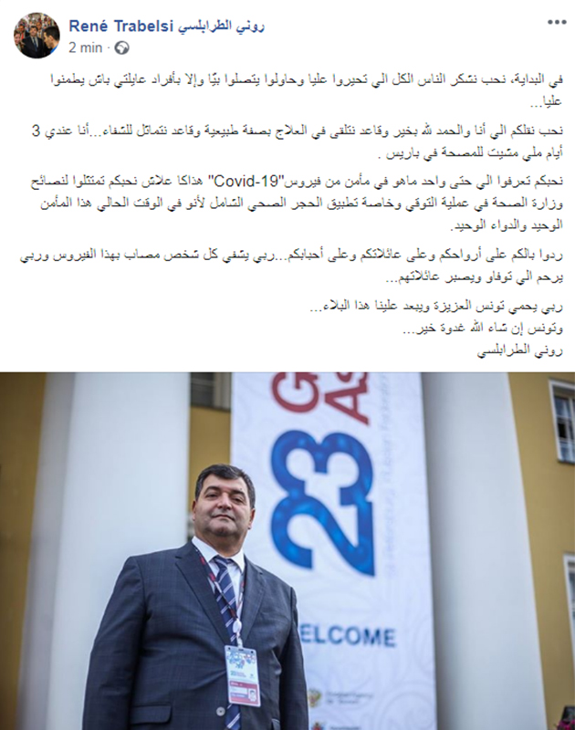 نشر وزير السياحة السابق روني الطرابلسي تدوينة على حسابه الشخصي بالفايسبوك ،أكد فيها أنه بصدد تلقي العلاج بصفة طبيعية بمصحة في باريس ،وأنه يتماثل للشفاء.