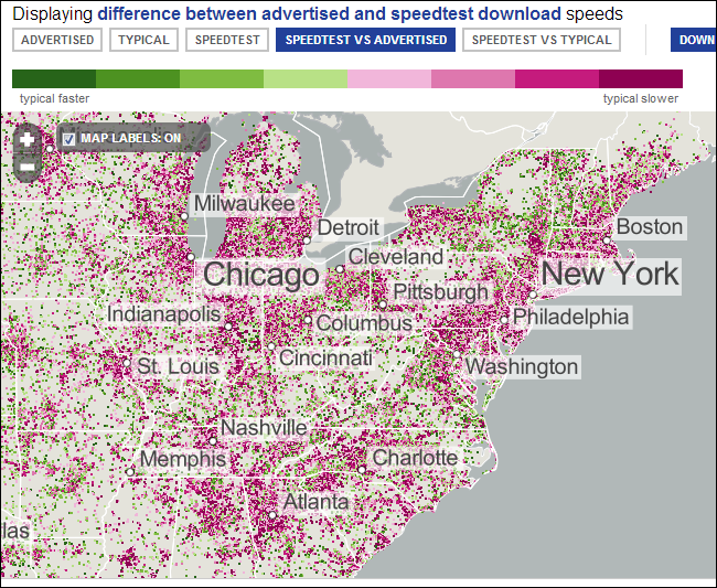 و الأمر لا ينطبق عليك فقط بل ينطبق على العديد من الزبناء هم أيضا لا تصلهم سرعة الأنترنيت التي يسددون تمنها في بداية كل شهر كما ستوضح لك الصورة بالأسفل العدد الكبير للمستخدمين الدين لا يحصلون على السرعة الكاملة لباقة الأنترنيت في أحد بلدان الولايات المتحدة حيت اللون البنفسجي  يعني نقط مستعملي الأنترنيت الدين يتحصلون على صبيب أنترنيت ضعيف من الذي يدفعون تمنه لشركة المزودة للخدمة و ما تبقى من اللون الأخضر يوضح مستعملي الأنترنيت الذين يتحصلون على سرعة أنترنيت جيدة.