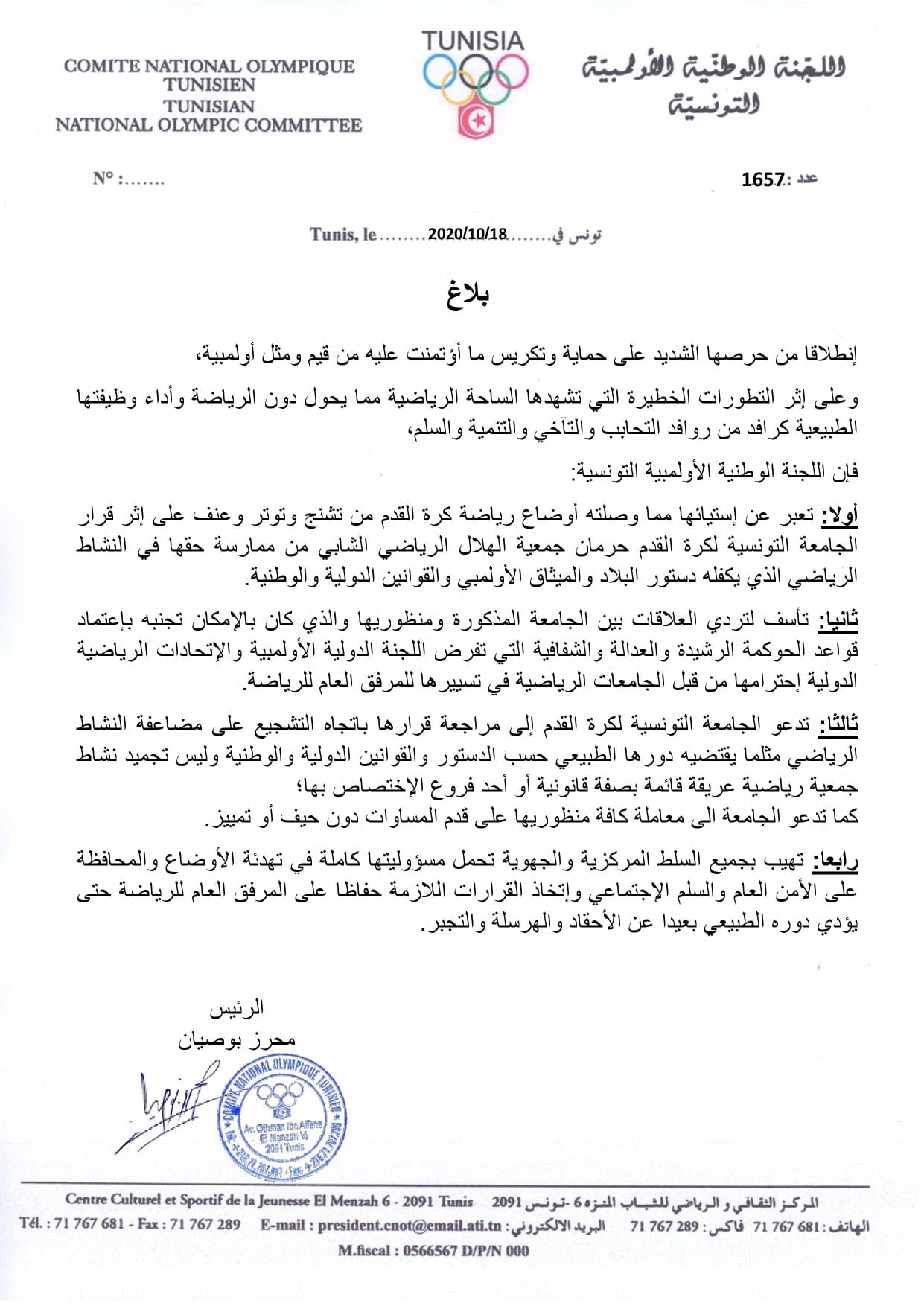اصدرت اللجنة الوطنية الاولمبية التونسية اليوم الاحد 18 اكتوبر 2020 بلاغا عبرت من خلاله عن استيائها مما وصلته اوضاع كرة القدم من تشنج و توتر و عنف على اثر قرار الجامعة التونسية لكرة القدم بتعليق نشاط جمعية هلال الشابة .