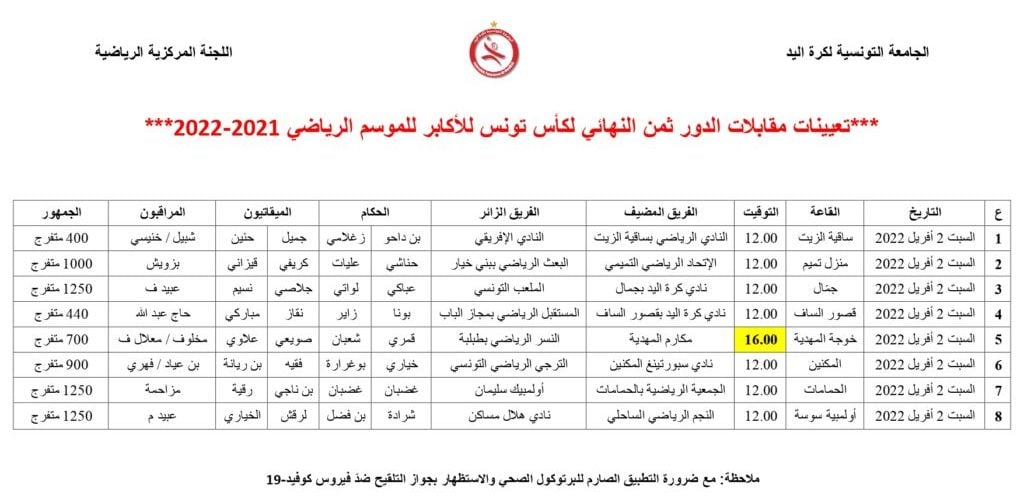 تدور يوم الغدالسبت 2 أفريل 2022 لقاءات الدور الثمن النهائي لكأس تونس أكابر وفق البرنامج التالي :