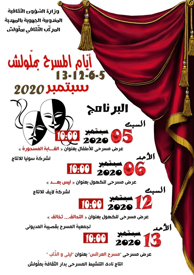 تنطلق غدا السبت فعاليات تظاهرة "أيام المسرح بملّولش" التي تمتد أيام 5 و 6 و 12 و 13 سبتمبر 2020 التي ينظمها المركب الثقافي بملّوش تحت إشراف المندوبية الجهوية للشؤون الثقافية بالمهدية.