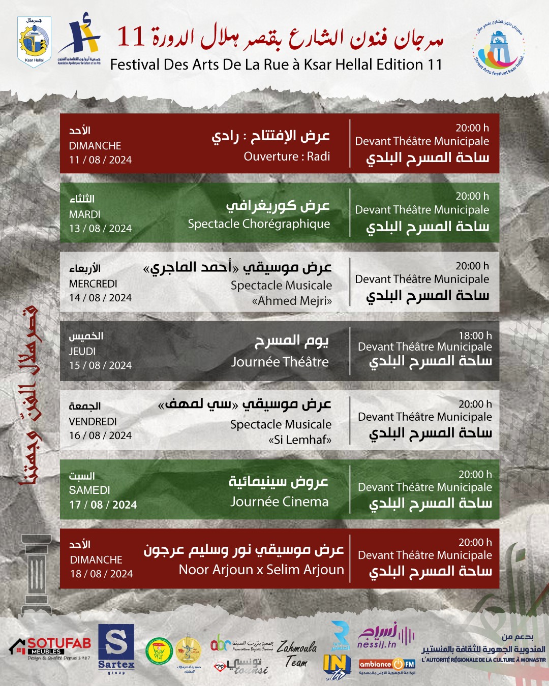وقد أُفتتح المهرجان يوم الأحد الفارط بعرض للفنان " رادي " على أن تُختتم فعالياته يوم الأحد القادم، الموافق ل 18 أوت بعرض موسيقي "لنور وسليم عرجون " . كما سيتضمن المهرجان عرضا موسيقيا للفنان "سي المهف"، وآخر" لأحمد الماجري " ، بالإضافة إلى عرض كوريغرافي و عروض أخرى مسرحية و سينمائية. يسعى المهرجان إلى أن يكون منصة لترويج الفنون والثقافة خارج الفضاءات التقليدية مثل المسارح وقاعات العرض، مما يعزز من وصول الفنون إلى جمهور أوسع ويشجع على المشاركة المجتمعية في الفنون.