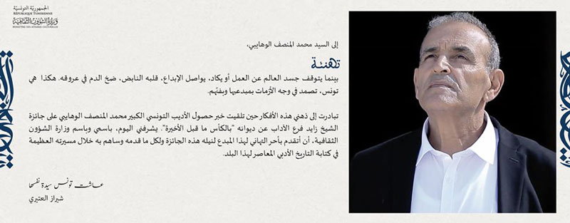 بمناسبة فوزه بجائزة الشيخ زايد للآداب وجهت وزارة الثقافة تهنئة إلى الشاعر محمد المنصف الوهايبي عن ديوانه الشعري "بالكأس ما قبل الأخيرة".