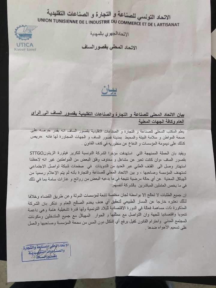 أصدر الاتحاد المحلي للصناعة و التجارة والصناعات التقليدية "UTICA" مؤخرا بيان مساندة للشركة التونسية لتكرير فيتورة الزيتون التي تتمركز على بعد بضعة كيلومترات من مناطق العمران في مدينة قصور الساف ، إستهجن فيه ما سماه حملة ممنهجة استهدفت الشركة و بين الاتحاد أنه لم يتلق بعد أي إشعار عن حالة مرضية ناتجة عن غازات و روائح سامة كما يدعي البعض وفقا لما ورد أيضا في البيان الذي حمل دفاعا مستميتا عن صاحب المشروع مقابل شيطنة كل الأطراف التي لمحت أو خاضت في ملف التلوث بل الأكثر من ذلك أن البيان اعتبر أن ما قيل و كتب حول هذا الموضوع هو ثلب علني و تشويه و عمل على تسميم الأجواء و كأن من كتبوا عن هذا الملف هم خصوم لصاحب الشركة أو منافسون له و المضحك أكثر من ذلك أن الاتحاد استشهد بعدم وجود أية حالة مرضية و كأنه لا يعترف بنظرية الوقاية خير من العلاج و ربما سينتظر الاتحاد تسجيل حالات مرضية حتى يقتنع بمدى الضرر الذي يلحق الثروة الطبيعية و الذات البشرية .