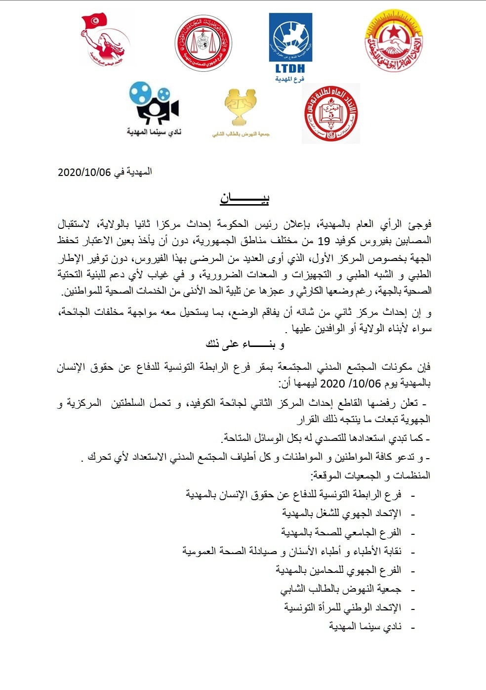 فإن مكونات المجتمع المدني المجتمعة بمقر فرع الرابطة التونسية للدفاع عن حقوق الإنسان بالمهدية يوم 2020/10/06 ليهمها أن: