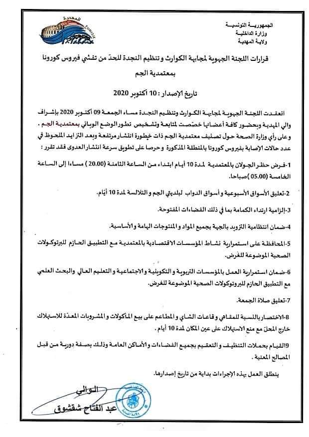 انعقدت اللجنة الجهوية لمجابهة الكوارث وتنظيم النجدة مساء الجمعة 09 أكتوبر 2020 بإشراف والي المهدية وبحضور كافة أعضائها خصّصت لمتابعة وتشخيص تطور الوضع الوبائي بمعتمدية الجم ، و على رأي وزارة الصحة حول تصنيف معتمدية الجم ذات خطورة انتشار مرتفعة وبعد التزايد الملحوظ في عدد حالات الإصابة بفيروس كورونا بالمنطقة المذكورة و حرصا على تطويق سرعة انتشار العدوى فقد تقرر :