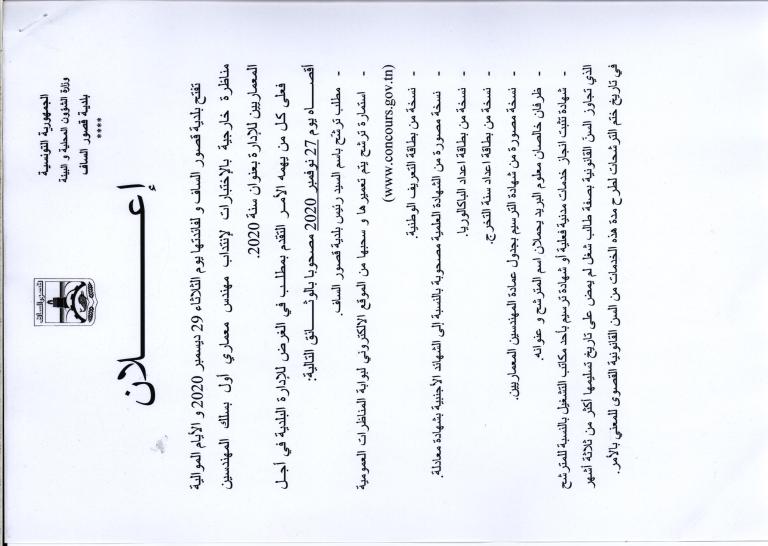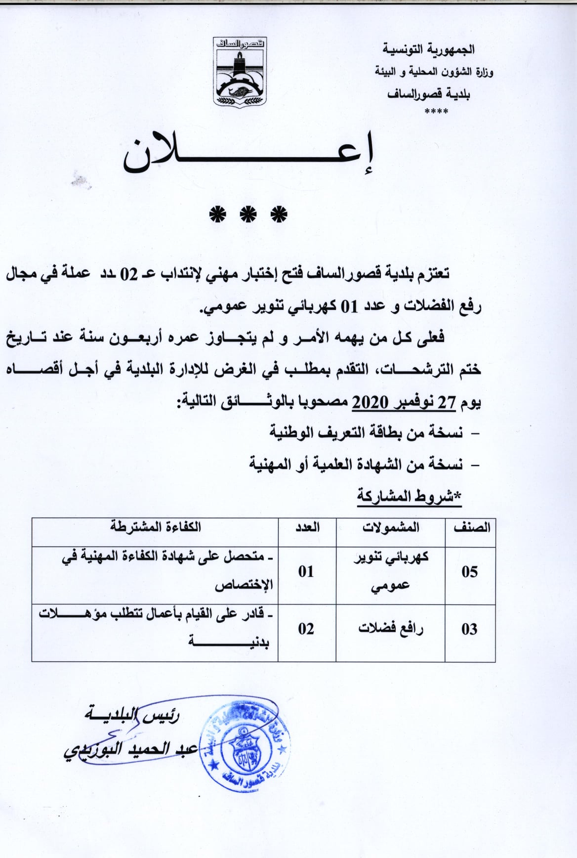 كما تعتزم بلدية قصور الساف فتح إختبار مهني لإنتداب (2) عملة في مجال رفع الفضلات و (1) كهربائي تنوير عمومي.