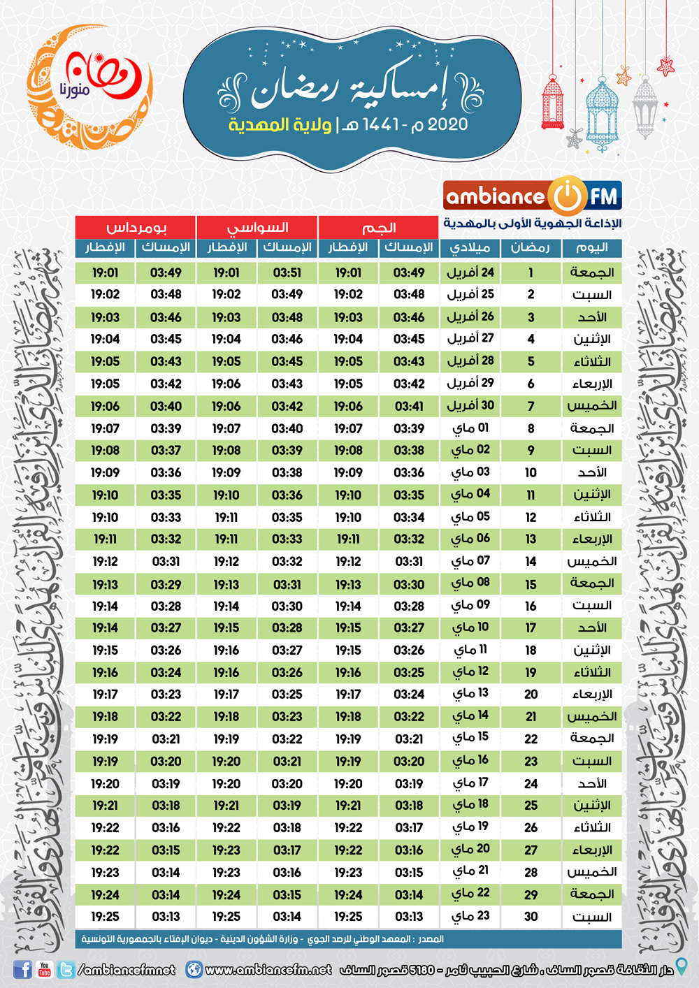 إمساكية شهر رمضان 2020 م / 1441هـ الخاصة بولاية المهدية
