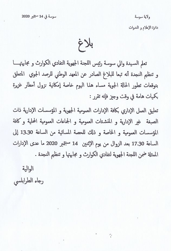أعلنت والية سوسة رجاء الطرابلسي في بلاغ صادر عن الولاية منذ قليل عن تعليق العمل بكافة المؤسسات العمومية و الخاصة خلال الحصة المسائية من اليوم الإثنين بالجهة نظرا لسوء الأحوال الجوية و تواصل التوقعات بنزول أمطار غزيرة.