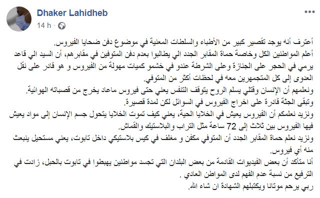 نشر الدكتور بالمستشفى العسكري، ذاكر لهذيب تدوينة على صفحته على موقع التواصل الإجتماعي "فايسبوك"، إعتبر فيها أنّ هناك ''تقصير كبير من الأطباء والسلطات المعنية في موضوع دفن ضحايا الفيروس''، وفيما يلي نصّها: