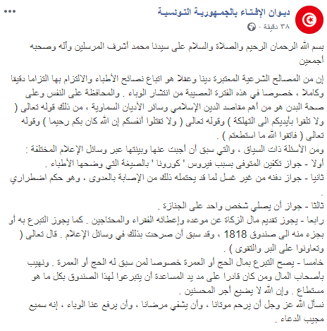 نشر ديوان الإفتاء بالجمهورية التونسية، منذ قليل، تدوينة على صفحته على الفايسبوك أوضح من خلالها مسألة تكفين ودفن المتوفي بفيروس كورونا.