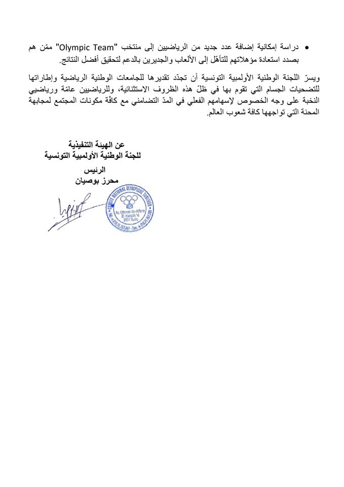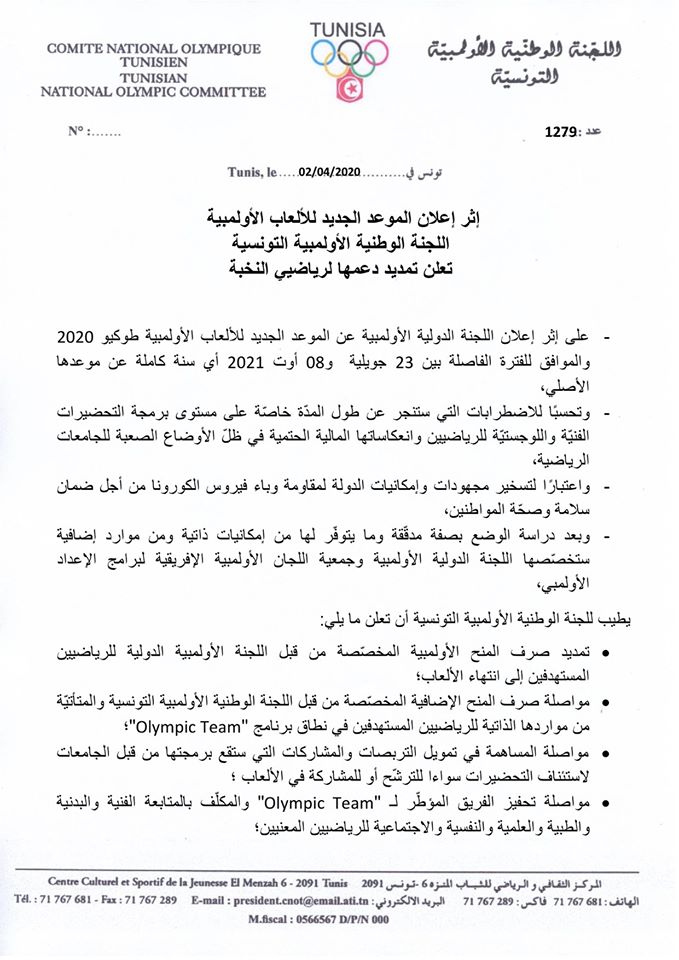 أعلنت اللجنة الوطنية الأولمبية في بلاغ لها عن جملة من القرارات بعد تأجيل أولمبياد طوكيو بسبب تفشي فيروس كورونا أبرزها مواصلة دعم رياضي النخبة و إليكم نص البلاغ: